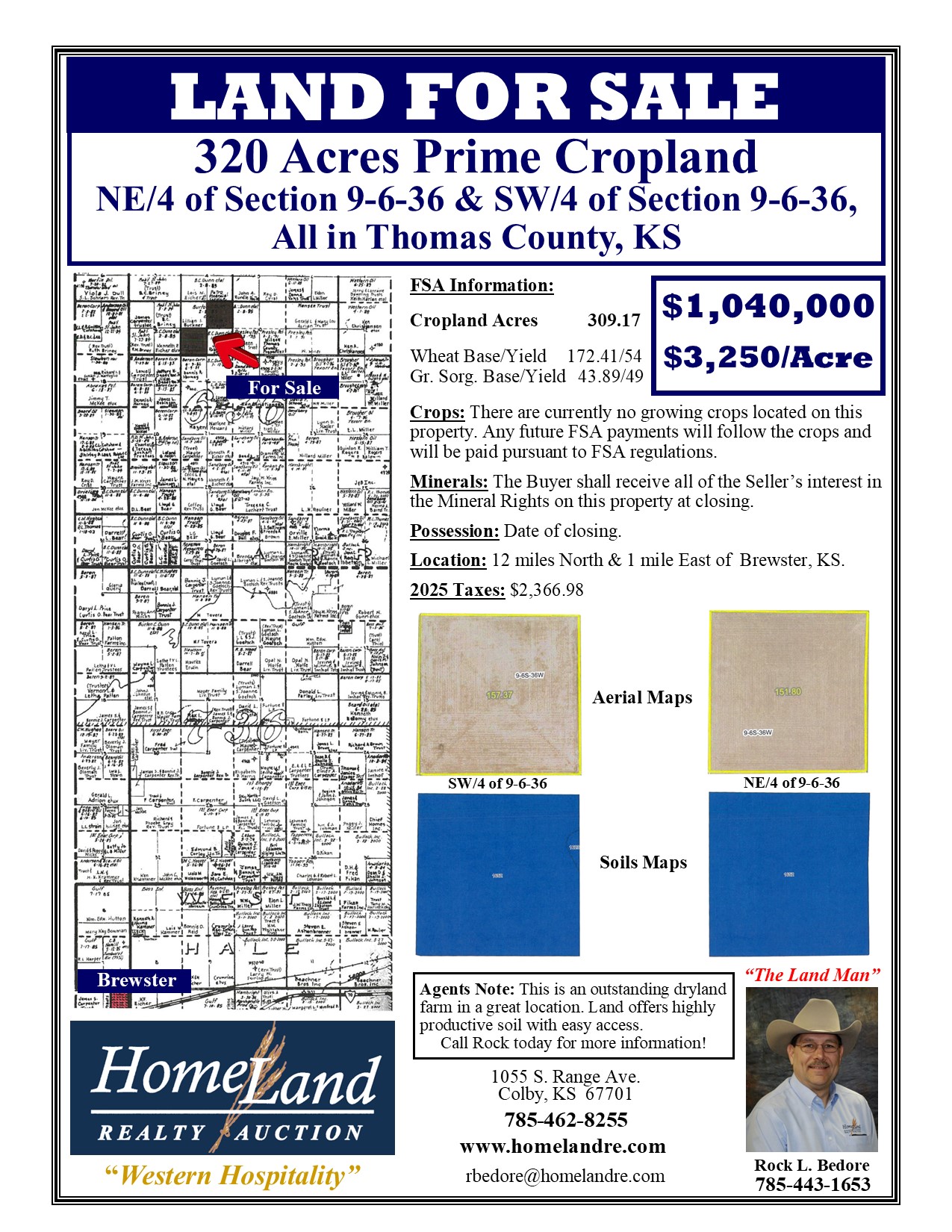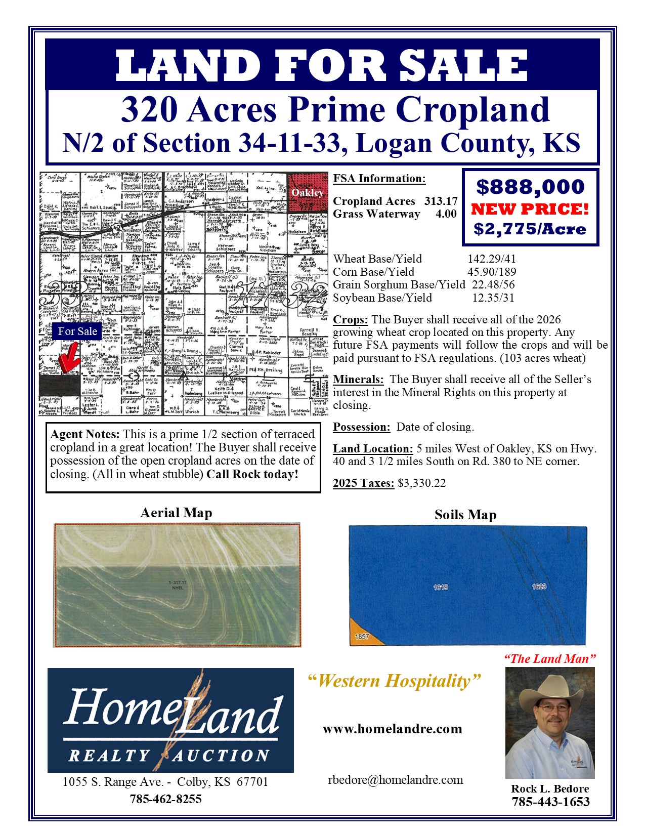 Land Location: 5 miles West of Oakley, KS on Hwy 40 and 3 1/2 miles South on Rd. 380 to NE corner.